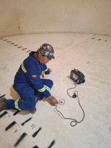 Ensayo especializado empleado para inspeccionar planchas de piso de tanques de almacenamiento metálicos, incluso con recubrimiento interno o externo. Un equipo MFL magnetiza el acero del fondo del tanque y detecta “fugas” en el campo magnético causadas por pérdidas de metal (corrosión o perforaciones). Es la técnica reconocida en estándares como API 653 para evaluar corrosión en fondos de tanques de forma rápida y cubrir el 100% de la superficie. Su aplicación permite identificar puntos de adelgazamiento severo o corrosión bajo el fondo, planificando reparaciones antes de que ocurra una fuga de producto.
